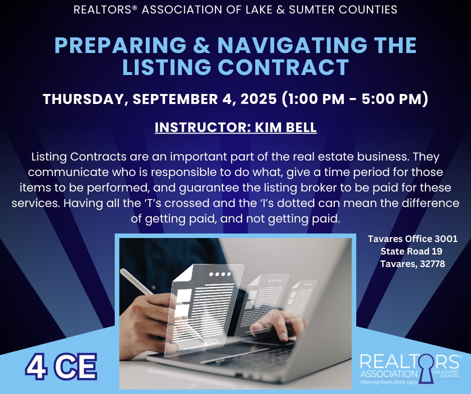 Listing Contracts are an important part of the real estate business. They communicate who is responsible to do what, give a time period for those items to be performed, and guarantee the listing broker to be paid for these services. Having all the ‘T’s crossed and the ‘I’s dotted can mean the difference of getting paid, and not getting paid. In this program you’ll become familiar with various types of listing contracts, the difference between them, and some options to guarantee compensation while making your way to the closing table.