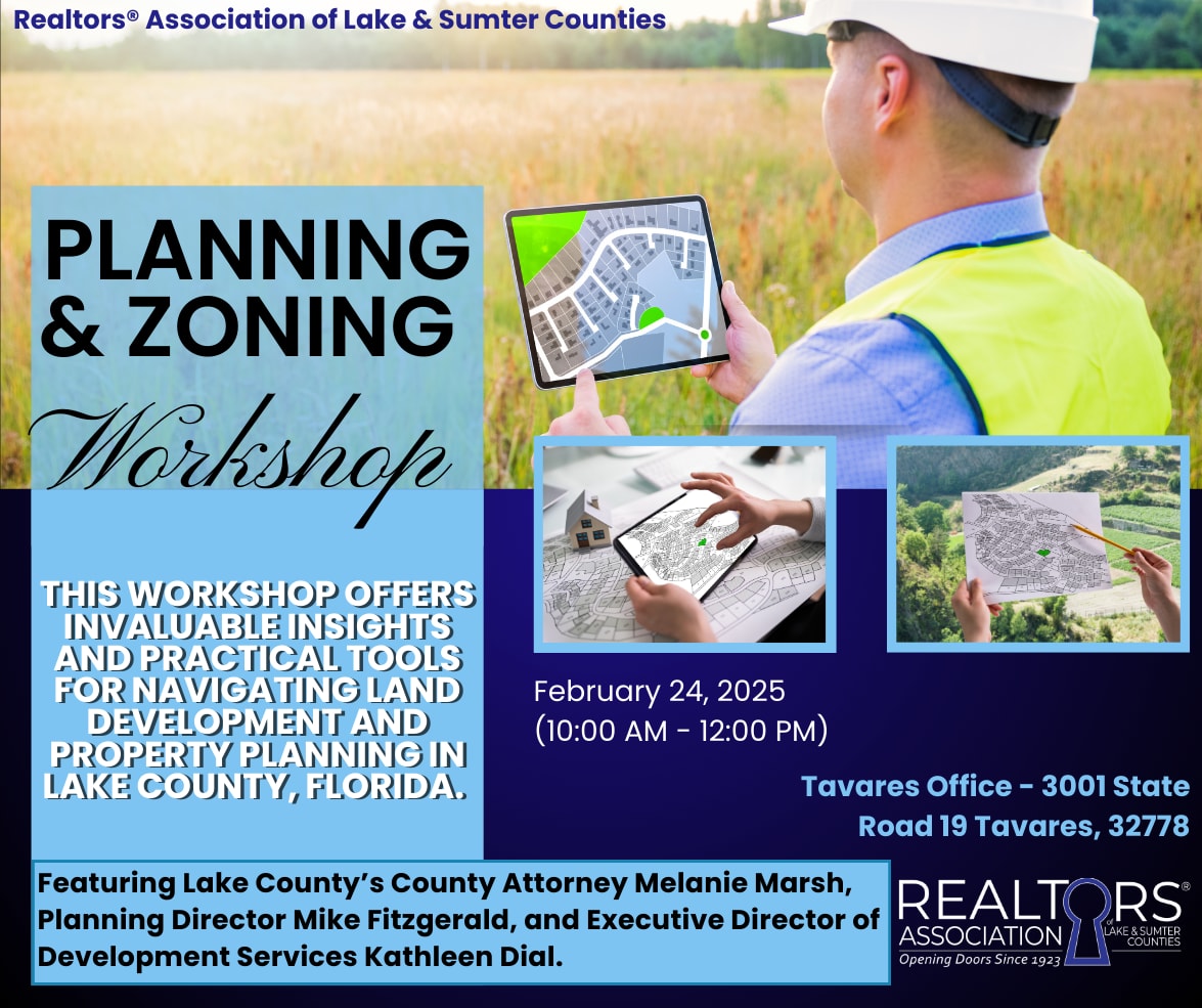 Join us for an engaging and informative Planning and Zoning Workshop tailored specifically for REALTORS® and real estate professionals. Featuring Lake County’s County Attorney Melanie Marsh, Planning Director Mike Fitzgerald, and Executive Director of Development Services Kathleen Dial, this workshop offers invaluable insights and practical tools for navigating land development and property planning in Lake County, Florida.