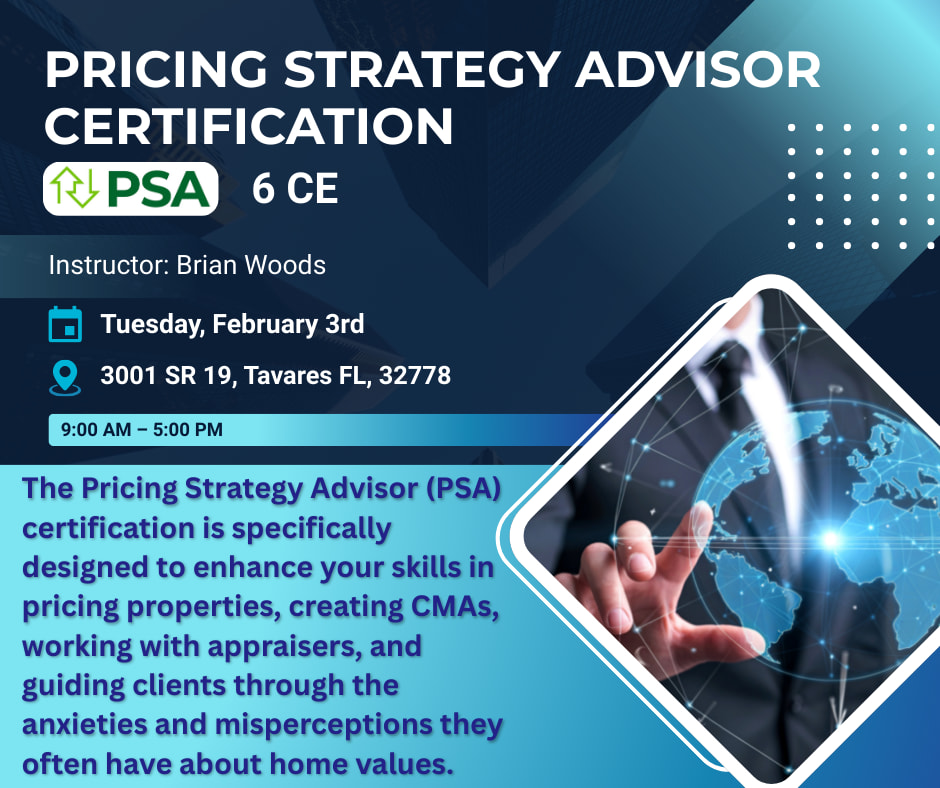 6 CE The Pricing Strategy Advisor (PSA) certification is specifically designed to enhance your skills in pricing properties, creating CMAs, working with appraisers, and guiding clients through the anxieties and misperceptions they often have about home values. Upon Course Completion: Instructor: Brian Woods Paperless Policy: No-Show Policy: In the event of extraordinary circumstances—such as a medical emergency or unforeseen personal hardship—refund requests may be reviewed on a case-by-case basis. This policy supports our commitment to delivering high-quality educational experiences and ensures that available seats can be offered to members eager to participate.