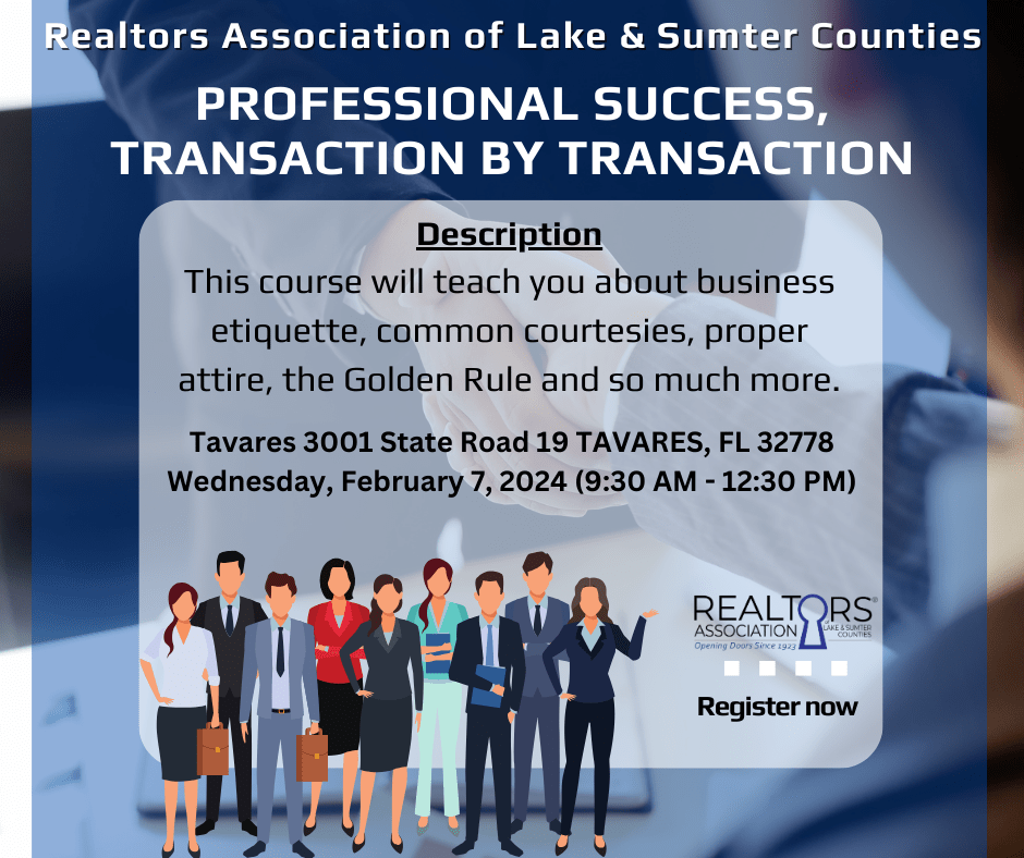 3 CE We’ve all seen it, MLS listings with no pictures, no room sizes, and no comments. You have to wonder, is this licensee just listing the property or trying to sell it? Licensees showing properties can be just as guilty; not leaving a business card, or not following up with the listing agent on how the showing appointment went! For far too long, licensees have been compared to bottom feeders. Let’s move up the food chain by using professional behavior in every transaction and with everyone we come in contact with during a transaction. This course will teach you about business etiquette, common courtesies, proper attire, the Golden Rule and so much more. Take a step up with Professional Success Transaction by Transaction. Objectives: After taking this class students will be able to: • Identify behavior that erodes professional performance • Discuss what constitutes professional behavior • Understand items that can stop a transaction before it gets started • Determine if you are showing property properly • Know the REALTOR® Pathways to Professionalism • Identify the most common transaction pitfalls • Understand the issues regarding disclosures Instructor: Denise Oyler