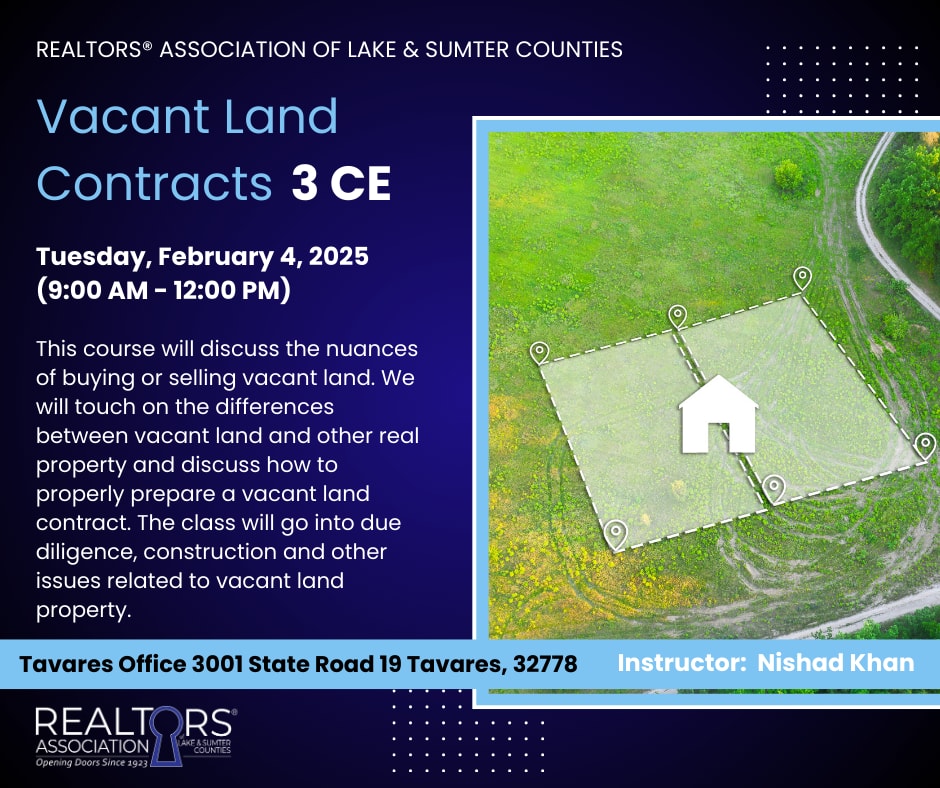 3 CE This course will discuss the nuances of buying or selling vacant land. We will touch on the differences between vacant land and other real property and discuss how to properly prepare a vacant land contract. The class will go into due diligence, construction and other issues related to vacant land property. Whether you are interested in learning about new residential construction or multifamily/commercial construction, this class will teach you all you need to know about vacant land properties. Instructor: Nishad Khan No-Show Policy: We understand that unforeseen circumstances may arise, making it difficult to attend scheduled classes. If you are unable to attend a class, kindly notify us 48 hours in advance. Cancellation notices should be sent to Alisha Kissee Garcia ( alisha@ralsc.org ).Participants who do not attend a class or event without providing prior notice will not be eligible for a refund. In cases of exceptional circumstances, such as a medical emergency or unforeseen personal crisis, we may consider refund requests on a case-by-case basis. As an Association committed to providing high-quality learning experiences, we have implemented this No-Show Policy to uphold the standards of our educational programs and ensure all members who are looking to attend a course get an opportunity to do so.